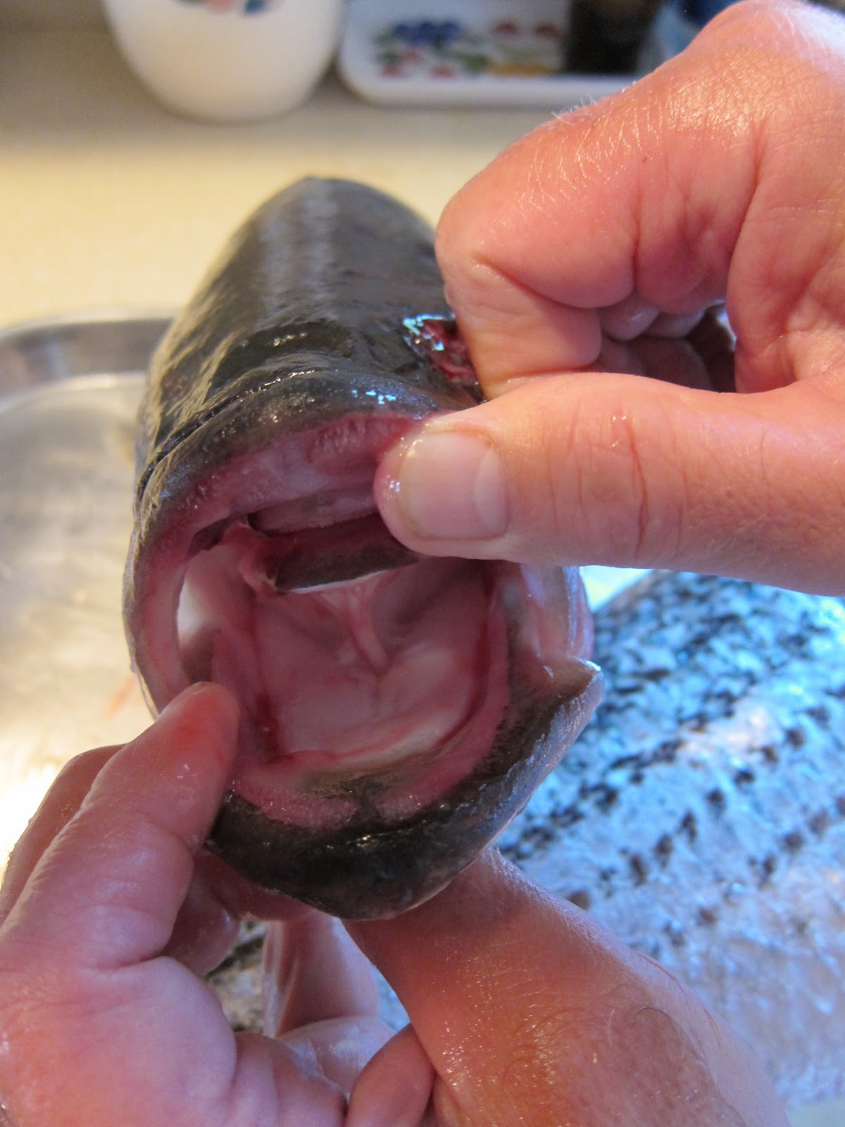 After staring at it a while and playing with it’s tongue (don’t ask), it was decided that my dad would cook the body, Jon would grill the head and my mom and I would cook the sides.